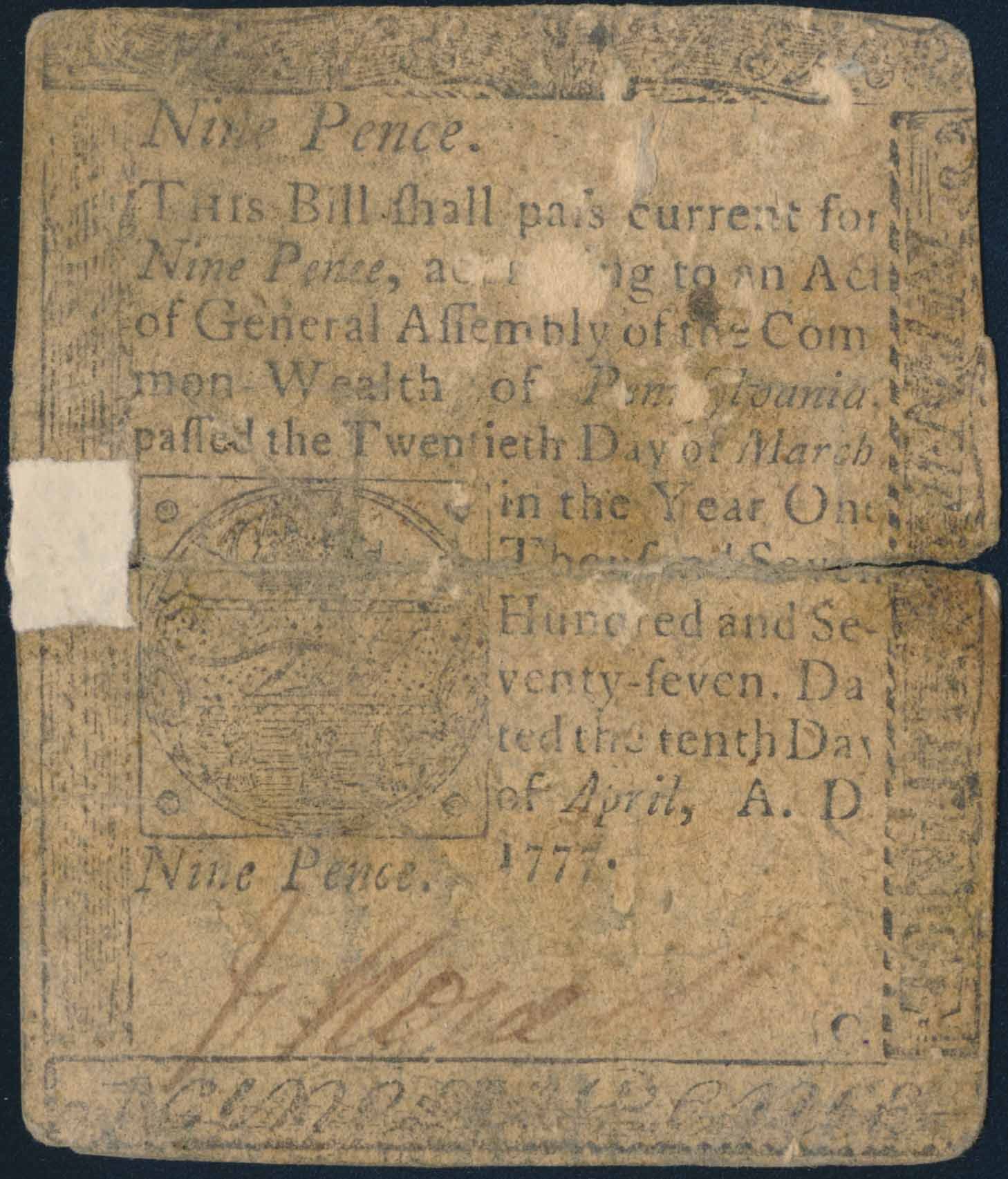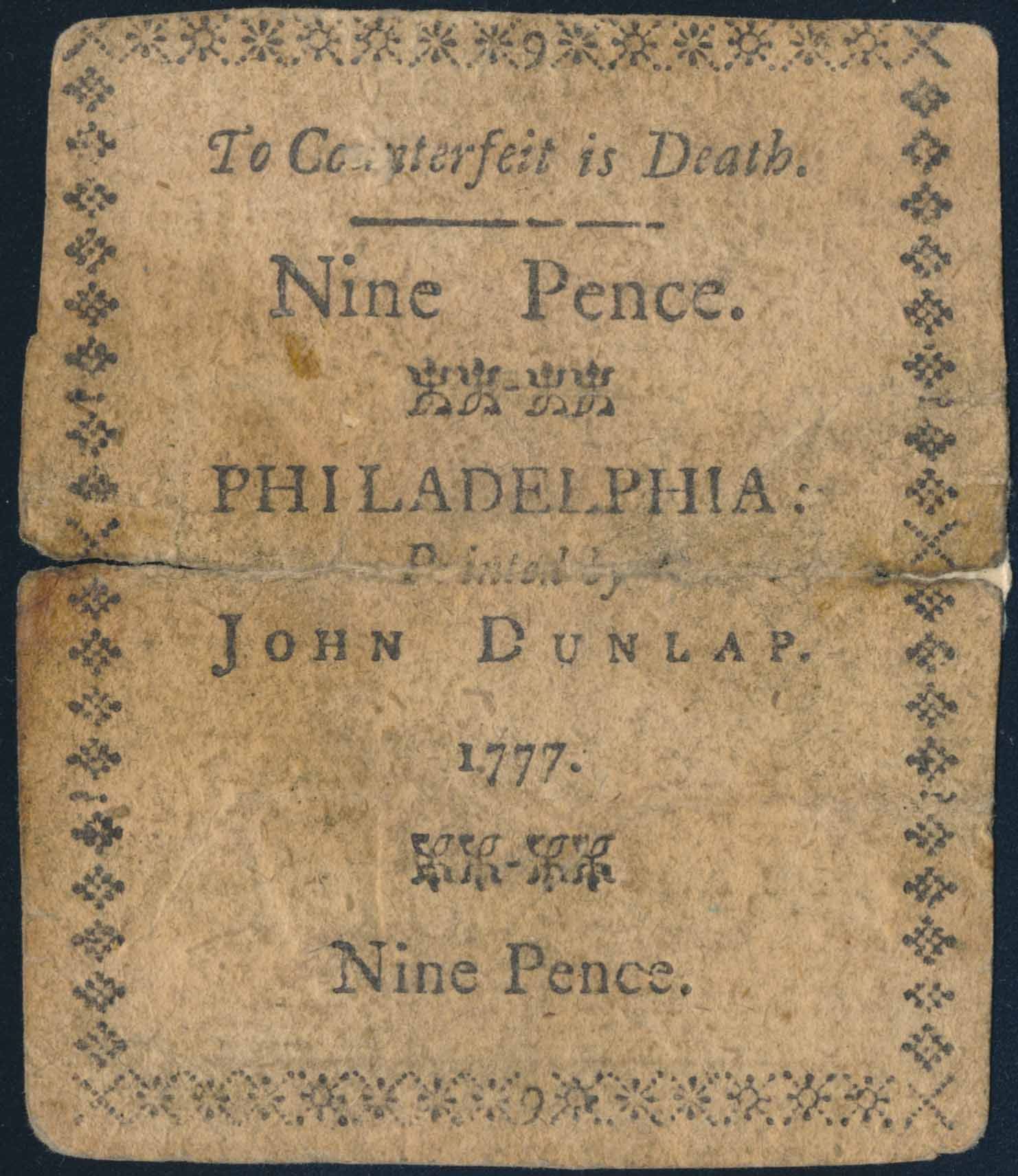 Continental Currency April 10, 1777 Note for Nine Pence John Dunlop