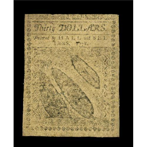<B>Continental Currency April 11, 1778 $30 Extremely Fine.</B></I> Although Newman does not list any $30 counterfeit for the Yorktown issue, we are quite convinced that this example is indeed counterfeit. It's nicely signed, rather well margined and quite high grade. There have been a few expert repairs at the outer edges, but they are virtually undetectable.