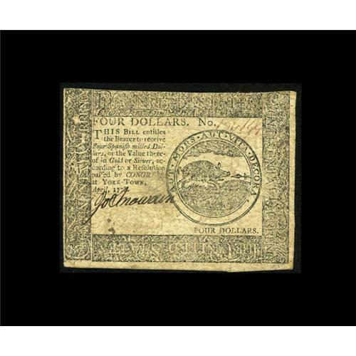 <B>Continental Currency April 11, 1778 $4 Extremely Fine.</B></I> A very pleasing and attractive example from this very scarce Yorktown issue which is by far the most challenging to obtain of any of the eleven Continental emissions. This note has very solid print quality for this type which was not well printed as a general rule. The boar vignette is sharp and there is one sharp signature and serial number. Most commonly seen in the VF and lower grades, examples in this high grade are quite a find indeed.