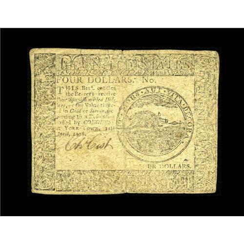 <B>Continental Currency April 11, 1778 $4 Fine.</B></I> A well circulated but problem-free genuine example from the very scarce Yorktown issue.<BR><BR><b>Shipping:</b> Coin/Currency (<a target="_blank" href="http://www.heritageauctions.com/common/shipping.php">view shipping information</a>)
