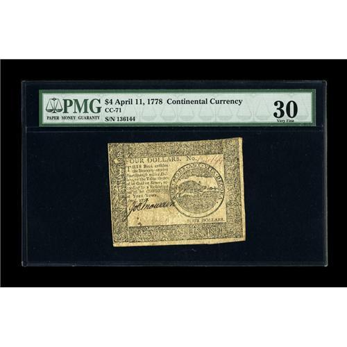 Continental Currency April 11, 1778 $4 PMG Very Fine 30