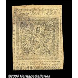 Continental Currency April 11, 1778 $40 Contemporary Counterfeit About New. Newman describes seven different varieties of Counterfeit $40 Yorktown notes in his Fourth Edition "The Early Paper Money of America." This is the third of them. Its most easily seen defining characteristic is in the fifth line of the text on the face, where all seven letters of the word "thereof" have their bases lower than any of the letters in "Value," the word that precedes it. This British-sponsored counterfeit was very deceptive. It is a tangible example of economic warfare. <BR><BR><B>Important notice:</B> Heritage usually auctions material at the rate of 200-250 lots per hour. On some occasions eBay Live bid software or the Internet may not be able to keep up with the pace of the auction. We recommend placing a realistic absentee bid now as insurance to avoid disappointment. Occasionally the auctioneer may eliminate or reject an eBay Live bid, and the auctioneer may also reopen a lot after the close of the eBay live bidding (usually because we missed an audience bid), and may reject your bid even if it shows you as the winning bidder. By bidding via eBay Live, you agree that Heritage may award the lot to another bidder at its sole discretion under the circumstances described above or any other reasonable circumstances. Since eBay bids are not shown to us until we open the lot on the floor, we treat those bids just like floor bids. In most cases the floor responds before the eBay bid is presented to us, due to Internet lag time, so for consistency we have made it a policy that floor bids are always considered first over tie eBay live bids. Also please note that all Heritage lots purchased through eBay Live carry a 20% Buyer's Premium. Please make sure you read the Terms and Conditions before you bid. <BR><BR><B>IMPORTANT ANNOUNCEMENT ABOUT RESERVES:</B> Heritage now divulges all reserves on its web site 7 days before every auction. If you want to know whether the reserve on this lot has been met, and if not, what the reserve amount is, please visit this lot page on the HeritageCoin.com web site, or email: bid@HeritageGalleries.com