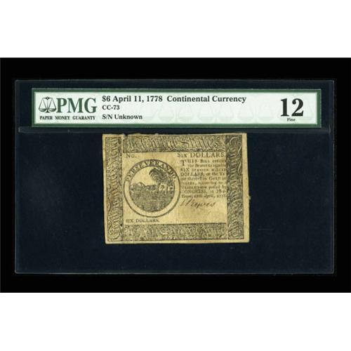 <B>Continental Currency April 11, 1778 $6 PMG Fine 12.</B></I> This piece boasts plenty of detail with an overall VF appearance. The Yorktown issue is often a roadblock in completing a Continental collection and it is little wonder; we have handled only two other examples of this denomination.<BR><BR><b>Shipping:</b> Coins & Currency (<a target="_blank" href="http://www.heritageauctions.com/common/shipping.php">view shipping information</a>)