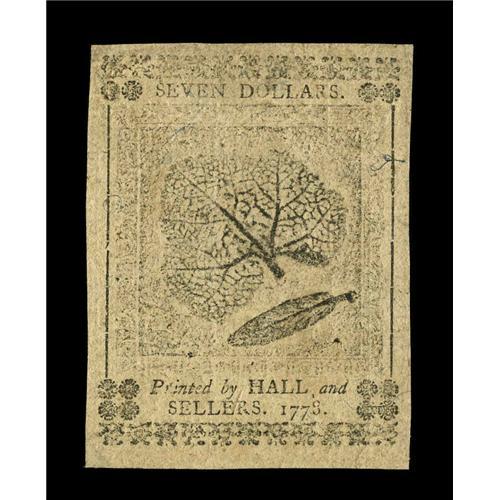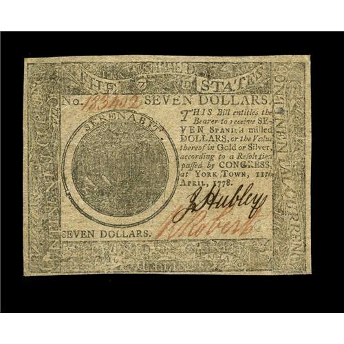 <B>Continental Currency April 11, 1778 $7 About New.</B></I> This is clearly not the counterfeit that is described in Newman and it is one of the nicer $7 Yorktowns that we've handled. In fact, it is the nicest Seven Dollar Yorktown that we have handled. It's well signed, well margined and with excellent overall eye appeal.