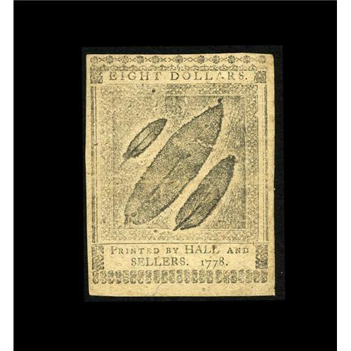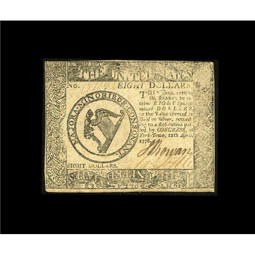 <B>Continental Currency April 11, 1778 $8 About New.</B></I> This Eight Dollar Yorktown note is closely margined on three sides, but clear of the design all the way around. It has a very nice overall appearance, with strong signatures and above-average printing quality. This April 11, 1778 issue is the rarest by far of any of the Continentals.