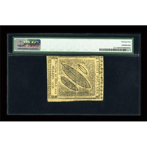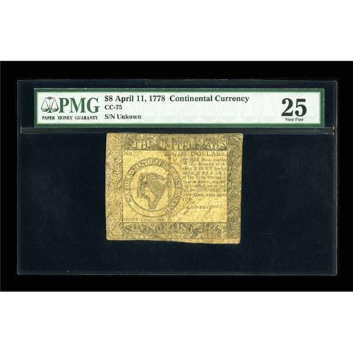 <B>Continental Currency April 11, 1778 $8 PMG Very Fine 25.</B></I> A pleasing York-Town issue that is original and free of repairs or major problems.<BR><BR><b>Shipping:</b> Coins & Currency (<a target="_blank" href="http://www.heritageauctions.com/common/shipping.php">view shipping information</a>)