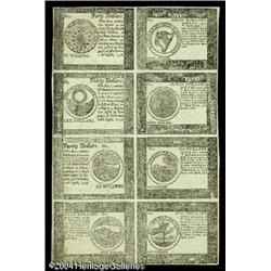 Continental Currency April 11, 1778 Half Sheet of Eig <B>Continental Currency April 11, 1778 Half Sheet of Eight Yorktown Blue Counterfeit Detectors About New.</B></I> To our best recollection, we have never handled any counterfeit detectors from this April 11, 1778 issue. This full pane is the only multiple whose existance we are aware of. The sheet has two light folds, but they do not touch any notes, all of which could be cut into simply beautiful examples. A very possibly unique item which in spite of its incredible rarity and desireability will likely sell around the $5,000 mark. <BR><BR><B>Important notice:</B> Heritage usually auctions material at the rate of 200-250 lots per hour. On some occasions eBay Live bid software or the Internet may not be able to keep up with the pace of the auction. We recommend placing a realistic absentee bid now as insurance to avoid disappointment. Occasionally the auctioneer may eliminate or reject an eBay Live bid, and the auctioneer may also reopen a lot after the close of the eBay live bidding (usually because we missed an audience bid), and may reject your bid even if it shows you as the winning bidder. By bidding via eBay Live, you agree that Heritage may award the lot to another bidder at its sole discretion under the circumstances described above or any other reasonable circumstances. Since eBay bids are not shown to us until we open the lot on the floor, we treat those bids just like floor bids. In most cases the floor responds before the eBay bid is presented to us, due to Internet lag time, so for consistency we have made it a policy that floor bids are always considered first over tie eBay live bids. Also please note that all Heritage lots purchased through eBay Live carry a 20% Buyer's Premium. Please make sure you read the Terms and Conditions before you bid. This lot is being auctioned in conjunction with a live floor auction by Heritage Galleries & Auctioneers. All final auction and invoice information will be supplied by Heritage Galleries & Auctioneers, and all other information should be considered preliminary. Lot:15053