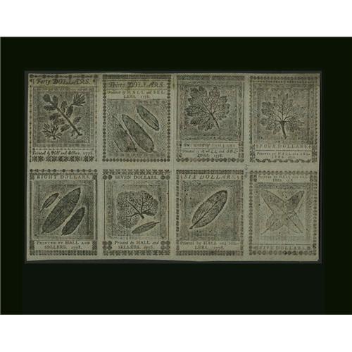 <B>Continental Currency April 11, 1778 Half Sheet of Eight Yorktown Blue Counterfeit Detectors About New.</B></I> To our best recollection, we have never handled any counterfeit detectors from this April 11, 1778 issue. This full pane is the only multiple whose existance we are aware of. The sheet has two light folds, but they do not touch any notes, all of which could be cut into simply beautiful examples. A very possibly unique item, which in spite of its incredible rarity and desirability will likely sell around the $5,000 mark.