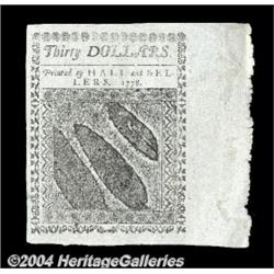 Continental Currency Blue Counterfeit Detector September 26, 1778 $30 Gem New. A bright, perfect example of this scarce detector. These were printed from genuine plates and distributed so that they could be compared with suspected notes to detect counterfeits. The blue paper was used to prevent the notes from being falsely filled in and spent. This example is unusually bright blue, with razor-sharp printing and a full one-inch deckled margin at the bottom. <BR><BR><B>Important notice:</B> Heritage usually auctions material at the rate of 200-250 lots per hour. On some occasions eBay Live bid software or the Internet may not be able to keep up with the pace of the auction. We recommend placing a realistic absentee bid now as insurance to avoid disappointment. Occasionally the auctioneer may eliminate or reject an eBay Live bid, and the auctioneer may also reopen a lot after the close of the eBay live bidding (usually because we missed an audience bid), and may reject your bid even if it shows you as the winning bidder. By bidding via eBay Live, you agree that Heritage may award the lot to another bidder at its sole discretion under the circumstances described above or any other reasonable circumstances. Since eBay bids are not shown to us until we open the lot on the floor, we treat those bids just like floor bids. In most cases the floor responds before the eBay bid is presented to us, due to Internet lag time, so for consistency we have made it a policy that floor bids are always considered first over tie eBay live bids. Also please note that all Heritage lots purchased through eBay Live carry a 20% Buyer's Premium. Please make sure you read the Terms and Conditions before you bid. <BR><BR><B>IMPORTANT ANNOUNCEMENT ABOUT RESERVES:</B> Heritage now divulges all reserves on its web site 7 days before every auction. If you want to know whether the reserve on this lot has been met, and if not, what the reserve amount is, please visit this lot page on the HeritageCoin.com web site, or email: bid@HeritageGalleries.com