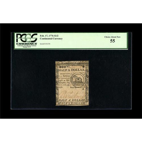 <B>Continental Currency February 17, 1776 $1/2 PCGS Choice About New 55.</B></I> This well centered example is one of the nicest pieces for this issue we have had in quite some time.<BR><BR><b>Shipping:</b> Coins & Currency (<a target="_blank" href="http://www.heritageauctions.com/common/shipping.php">view shipping information</a>)