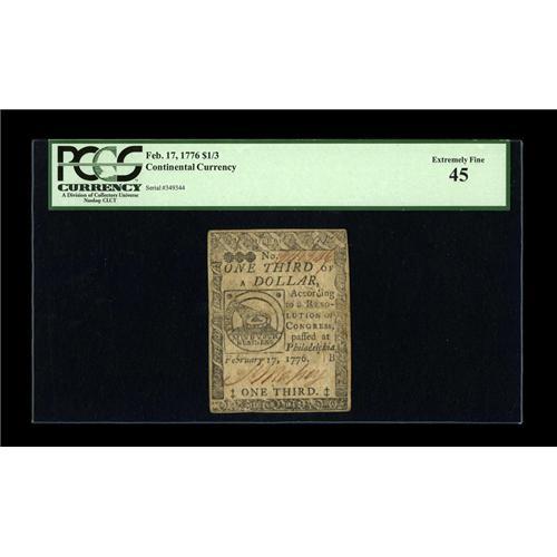 <B>Continental Currency February 17, 1776 $1/3 PCGS Extremely Fine 45.</B></I> This Fugio fractional note has light folds, as well as bright signatures and serial number.<BR><BR><b>Shipping:</b> Coins & Currency (<a target="_blank" href="http://www.heritageauctions.com/common/shipping.php">view shipping information</a>)