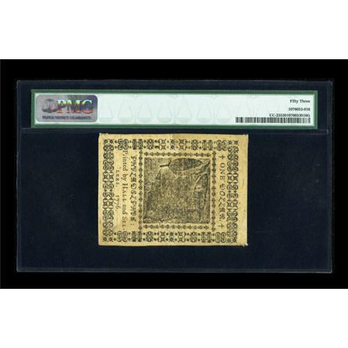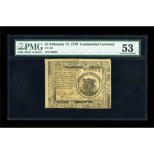 <B>Continental Currency February 17, 1776 $1 PMG About Uncirculated 53</B></I>. $1 Continentals are a more challenging denomination to locate as they were produced for only five of the eleven issues. This lightly circulated note is a bit tight along the bottom.<BR><BR><b>Shipping:</b> Coins & Currency (<a target="_blank" href="http://www.heritageauctions.com/common/shipping.php">view shipping information</a>)
