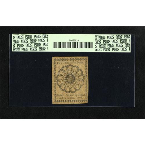 <B>Continental Currency February 17, 1776 $2/3 PCGS Fine 15.</B></I> This boldly signed and numbered Fugio fractional note is well printed and appears to be at least Very Fine in grade. Impeccable detail is found on both the sundial and the chain links on the back.<BR><BR><b>Shipping:</b> Coins & Currency (<a target="_blank" href="http://www.heritageauctions.com/common/shipping.php">view shipping information</a>)