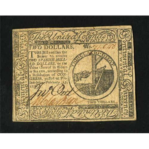 <B>Continental Currency February 17, 1776 $2 Extremely Fine-About New.</B></I> Matthew Clarkson, who signed this note, was a member of the Continental Congress. <BR><BR><b>Shipping:</b> Coins & Currency (<a target="_blank" href="http://www.heritageauctions.com/common/shipping.php">view shipping information</a>)
