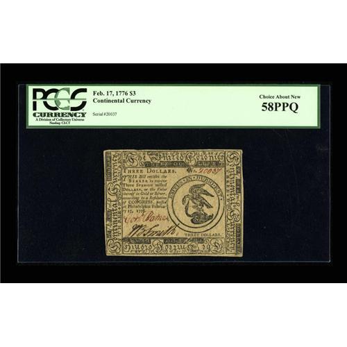 <B>Continental Currency February 17, 1776 $3 PCGS Choice About New 58PPQ.</B></I> The margins are complete on this pleasing example.<BR><BR><b>Shipping:</b> Coins & Currency (<a target="_blank" href="http://www.heritageauctions.com/common/shipping.php">view shipping information</a>)