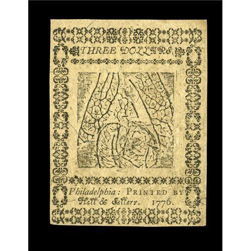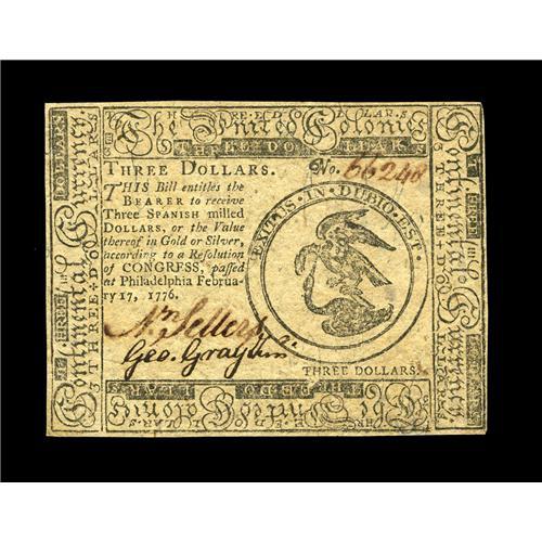 <B>Continental Currency February 17, 1776 $3 Very Choice New.</B></I> A lovely note, strongly printed on both sides and coming quite close to the full Gem grade.