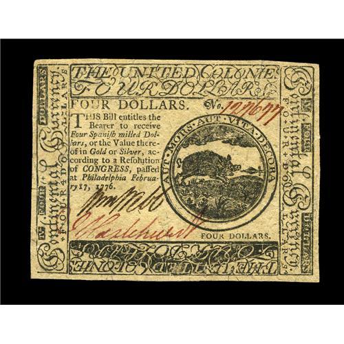 <B>Continental Currency February 17, 1776 $4 Choice About New.</B></I> This beautifully printed note has great margins and all the eye-appeal of a perfect Gem. It is held from that grade by only a single, very light center fold.