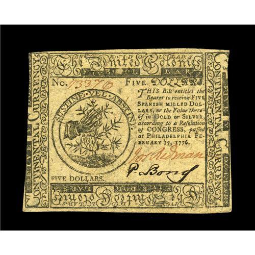 <B>Continental Currency February 17, 1776 $5 Choice About New.</B></I> A single light center fold away from the Choice New grade. Well signed, bright and attractive.