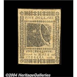 Continental Currency February 17, 1776 $5 Very Choice New. Crisp and bright, with margin all around, strong signatures and good eye appeal. Nice Continentals like this are becoming very hard to find. <BR><BR><B>Important notice:</B> Heritage usually auctions material at the rate of 200-250 lots per hour. On some occasions eBay Live bid software or the Internet may not be able to keep up with the pace of the auction. We recommend placing a realistic absentee bid now as insurance to avoid disappointment. Occasionally the auctioneer may eliminate or reject an eBay Live bid, and the auctioneer may also reopen a lot after the close of the eBay live bidding (usually because we missed an audience bid), and may reject your bid even if it shows you as the winning bidder. By bidding via eBay Live, you agree that Heritage may award the lot to another bidder at its sole discretion under the circumstances described above or any other reasonable circumstances. Since eBay bids are not shown to us until we open the lot on the floor, we treat those bids just like floor bids. In most cases the floor responds before the eBay bid is presented to us, due to Internet lag time, so for consistency we have made it a policy that floor bids are always considered first over tie eBay live bids. Also please note that all Heritage lots purchased through eBay Live carry a 20% Buyer's Premium. Please make sure you read the Terms and Conditions before you bid. <BR><BR><B>IMPORTANT ANNOUNCEMENT ABOUT RESERVES:</B> Heritage now divulges all reserves on its web site 7 days before every auction. If you want to know whether the reserve on this lot has been met, and if not, what the reserve amount is, please visit this lot page on the HeritageCoin.com web site, or email: bid@HeritageGalleries.com