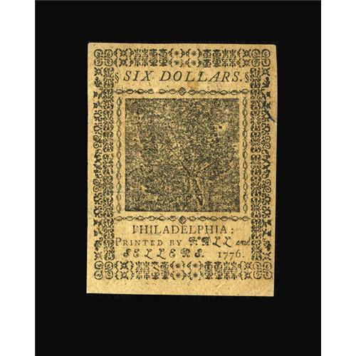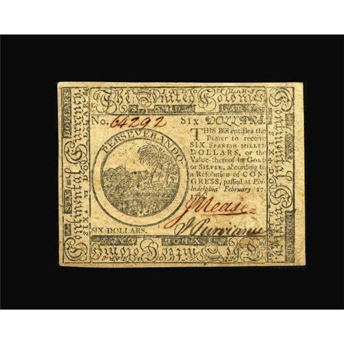 <B>Continental Currency February 17, 1776 $6 Choice New.</B></I> A nice Continental, with strong signatures, a sharply printed Beaver vignette and decent centering of both sides. <BR><BR><b>Shipping:</b> Coins & Currency (<a target="_blank" href="http://www.heritageauctions.com/common/shipping.php">view shipping information</a>)