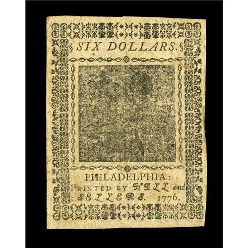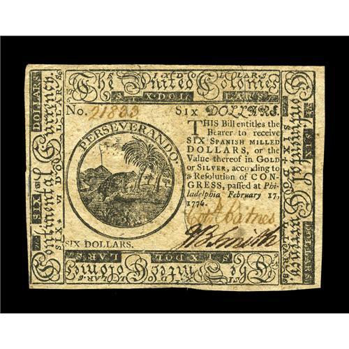 <B>Continental Currency February 17, 1776 $6 Very Choice New.</B></I> A near-Gem Continental, with strong signatures, a sharply printed Beaver vignette and excellent centering of both sides. A premium example.