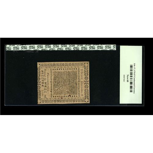 <B>Continental Currency February 17, 1776 $7 PCGS New 60.</B></I> A nice bright note that couldn't get past the 60 grade due to margins that touch the design in a few places.