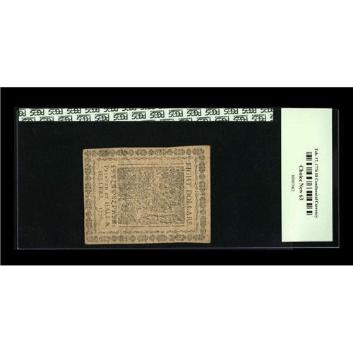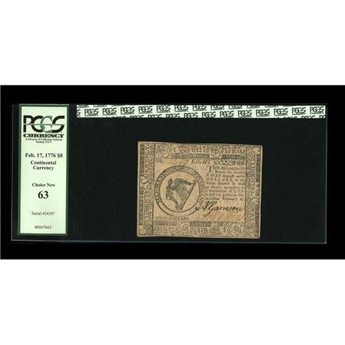 <B>Continental Currency February 17, 1776 $8 PCGS Choice New 63.</B></I> An attractive note, with a strong nature print and decent margins all around.