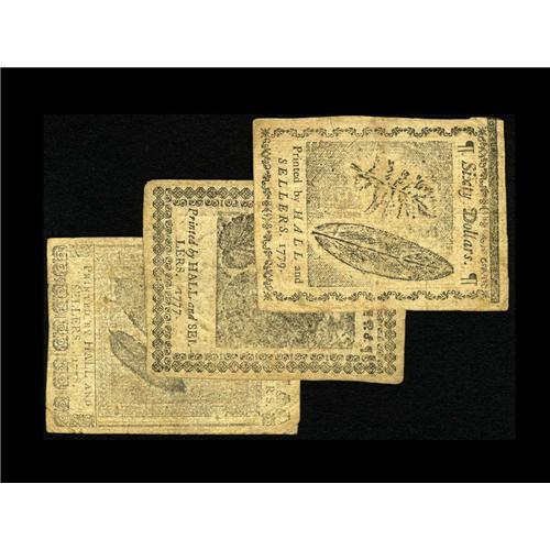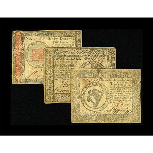 <B>A Trio of Continentals</B></I><BR>Continental Currency February 26, 1777 $2 <B>About New</B></I><BR>Continental Currency September 26, 1778 $8 <B>VF</B></I><BR>Continental Currency January 14, 1779 $60 <B>XF.</B></I><BR><I>From The Plymouth Rock Collection</B></I>