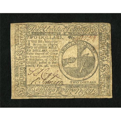 <B>Continental Currency February 26, 1777 $2 Extremely Fine.</B></I> There are a few light stains on the back of this high-end circulated piece. These Baltimore-issued Continentals are always popular.<BR><BR><b>Shipping:</b> Coins & Currency (<a target="_blank" href="http://www.heritageauctions.com/common/shipping.php">view shipping information</a>)