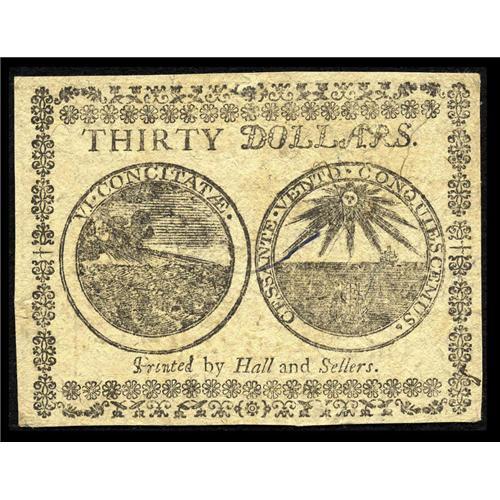 <B>Continental Currency February 26, 1777 $30 Choice About New.</B></I> A nearly invisible centerfold holds this handsome Baltimore issue note from the Gem grade. The $30 denomination features two vignettes on the back as well as one on the face. On this note, all three are sharp and attractive.
