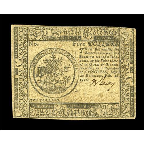 <B>Continental Currency February 26, 1777 $5 Extremely Fine.</B></I> This scarcer Baltimore issue note is signed by Benjamin Levy.