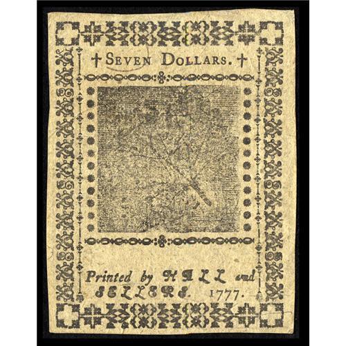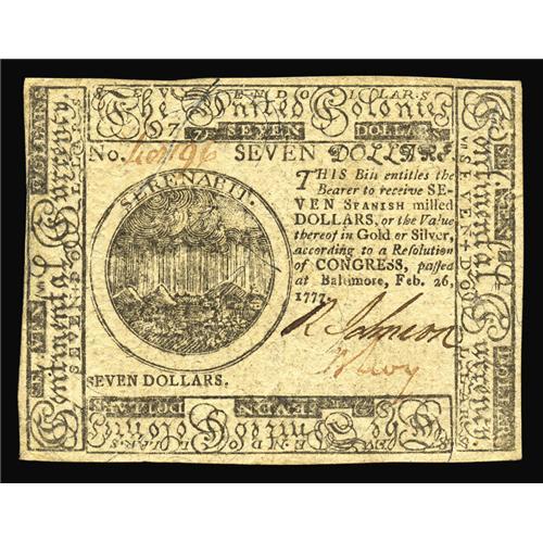 <B>Continental Currency February 26, 1777 $7 Choice About New.</B></I> This 1777 issue note bears the red signature of Benjamin Levy. A light diagonal fold and cornerfold hold it from the Choice New grade.