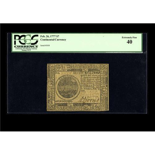 <B>Continental Currency February 26, 1777 $7 PCGS Extremely Fine 40.</B></I> This is a lightly circulated example of this scarcer Baltimore issue which has a couple of light folds.<BR><BR><b>Shipping:</b> Coins & Currency (<a target="_blank" href="http://www.heritageauctions.com/common/shipping.php">view shipping information</a>)