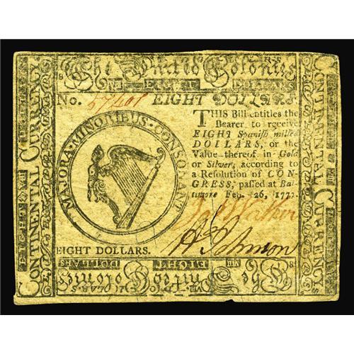<B>Continental Currency February 26, 1777 $8 Choice About New.</B></I> Very well printed, but a with couple corner bumps and a notch out of the bottom margin.