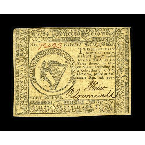 <B>Continental Currency February 26, 1777 $8 Choice About New.</B></I> This is a very lightly circulated example of this somewhat more desirable issue that has been blessed with superb print quality, bold signatures and excellent paper quality.<BR><BR><b>Shipping:</b> Coin/Currency (<a target="_blank" href="http://www.heritageauctions.com/common/shipping.php">view shipping information</a>)