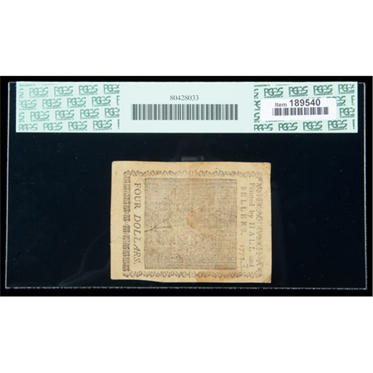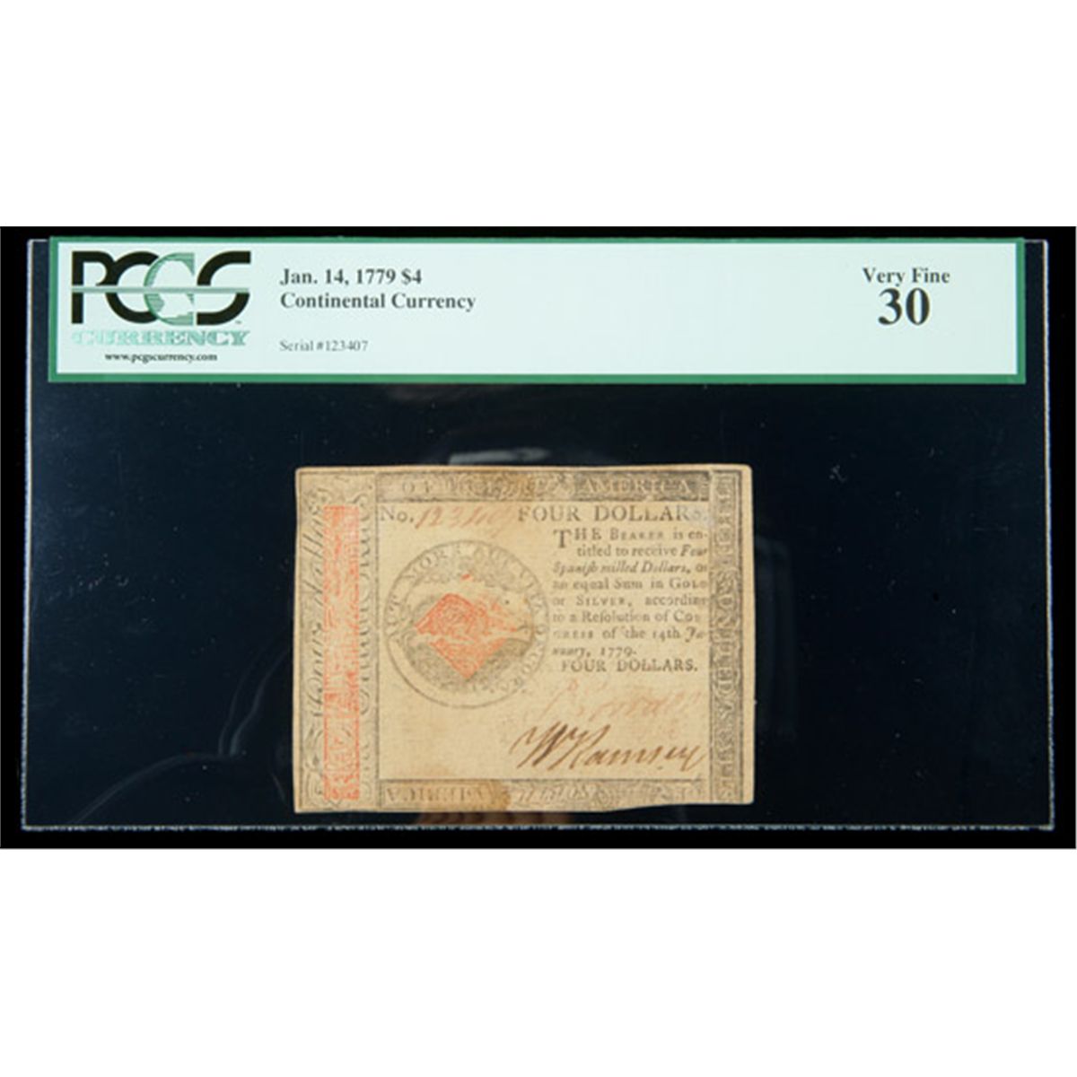 Continental Currency Jan. 14 1779 $4. PCGS Very Fine 30. . Fr-CC-90. This $4 note has good eye appeal for the grade and is limited only by some very minor staining.