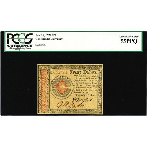 <B>Continental Currency January 14, 1779 $20 PCGS Choice About New 55PPQ.</B></I><BR>A very well printed note with good signatures and serial number as well as a single light fold at right to its credit.
