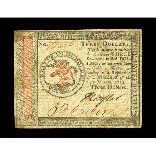 <B>Continental Currency January 14, 1779 $3 Very Fine.</B></I> A very nice note save for some minor staining at the corners.
