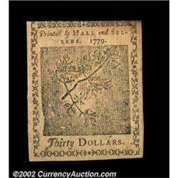 Continental Currency January 14, 1779 $30 Choice New. The centering is a bit off, and the note has an aged corner tip, but it's bright elsewhere and quite attractive. Important notice: We expect to be auctioning lots at the rate of 200-250 per hour. Sometimes eBay Premier live bid software cannot keep up with that pace, so we strongly recommend that you place a realistic proxy bid now as insurance to avoid disappointment. Also please note that all Heritage/CAA lots purchased through eBay Premier carry a 20% Buyer's Premium. Please make sure you read the Terms and Conditions.