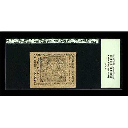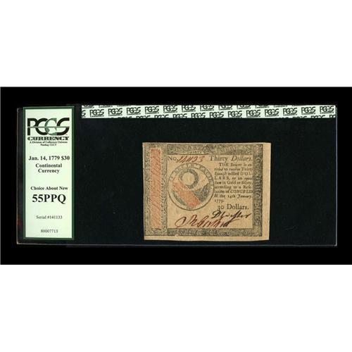 <B>Continental Currency January 14, 1779 $30 PCGS Choice About New 55PPQ.</B></I> A real beauty, with bold signatures, great color and margins all the way around.