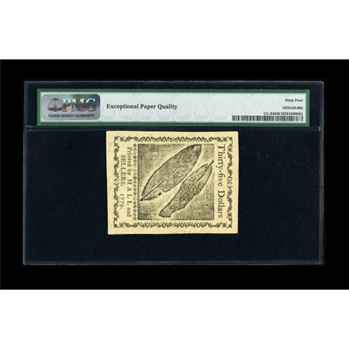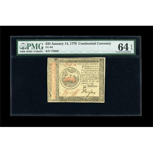 <B>Continental Currency January 14, 1779 $35 PMG Choice Uncirculated 64 EPQ.</B></I> Wonderful centering is noticed along with even margins. The color and inks are deep and the signatures strong.<BR><BR><b>Shipping:</b> Coins & Currency (<a target="_blank" href="http://www.heritageauctions.com/common/shipping.php">view shipping information</a>)