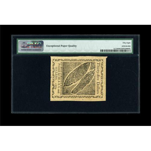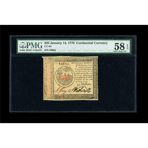 <B>Continental Currency January 14, 1779 $35 PMG Choice About Unc 58 EPQ.</B></I> This pleasing note just misses being Gem due to some difficult to see handling.<BR><BR><b>Shipping:</b> Coins & Currency (<a target="_blank" href="http://www.heritageauctions.com/common/shipping.php">view shipping information</a>)