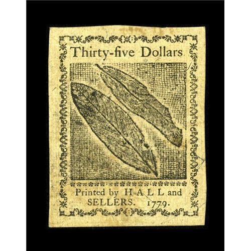 <B>Continental Currency January 14, 1779 $35 Very Choice New.</B></I> This near-Gem example also bears the bold red signature of Gardner. This $35 denomination was printed only for the eleventh and final issue of Continental Currency. This particular example is well margined, with distinct original embossing still present.<BR><BR><b>Shipping:</b> Coins & Currency (<a target="_blank" href="http://www.heritageauctions.com/common/shipping.php">view shipping information</a>)