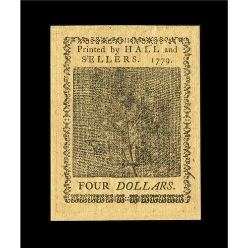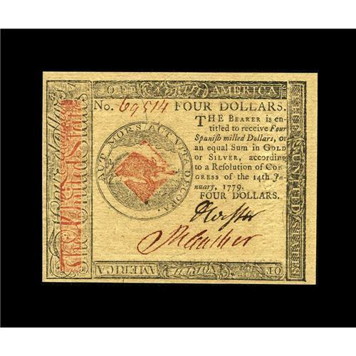 <B>Continental Currency January 14, 1779 $4 Gem New.</B></I> A lovely note with exceptional margins, clear printing on both sides, good signatures and ultra-clean surfaces. Super quality. Last sold by CAA in May of 1999.<BR><BR><b>Shipping:</b> Coin/Currency (<a target="_blank" href="http://www.heritageauctions.com/common/shipping.php">view shipping information</a>)