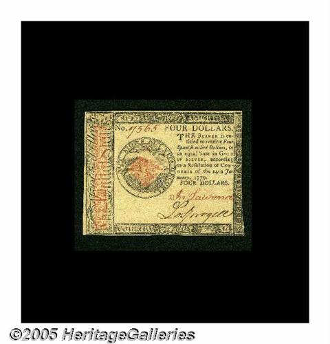 <B>Continental Currency January 14, 1779 $4 Very Choice New.</B></I> A beautifully fresh example, with ideal back centering and bold print quality on both sides. The note would be a perfect Gem if the right face margin did not just touch the design.