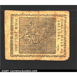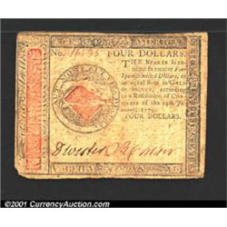 Continental Currency January 14, 1779 $4 Very Fine.<p>The lower left corner is quite rounded on this otherwise nice example of the final Continental issue. Important notice: We expect to be auctioning lots at the rate of 200-250 per hour. Sometimes eBay Premier live bid software cannot keep up with that pace, so we strongly recommend that you place a realistic proxy bid now as insurance to avoid disappointment. Also please note that all Heritage/CAA lots purchased through eBay Premier carry a 20% Buyer's Premium.