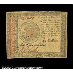 Continental Currency January 14, 1779 $45 Choice Very Fine. Lightly circulated and problem free. This $45 denomination is found only in this eleventh and final issue of Continental Currency. Important notice: We expect to be auctioning lots at the rate of 200-250 per hour. Sometimes eBay Premier live bid software cannot keep up with that pace, so we strongly recommend that you place a realistic proxy bid now as insurance to avoid disappointment. Also please note that all Heritage/CAA lots purchased through eBay Premier carry a 20% Buyer's Premium. Please make sure you read the Terms and Conditions.