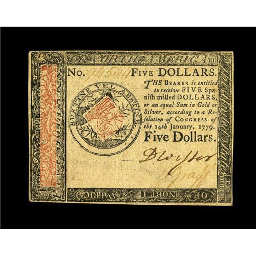 <B>Continental Currency January 14, 1779 $5 Choice About New.</B></I> A pleasing example from this final Continental emission that looks like a Choice New note but which has picked up a couple of very minor corner folds.<BR><BR><b>Shipping:</b> Coin/Currency (<a target="_blank" href="http://www.heritageauctions.com/common/shipping.php">view shipping information</a>)