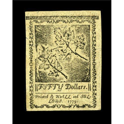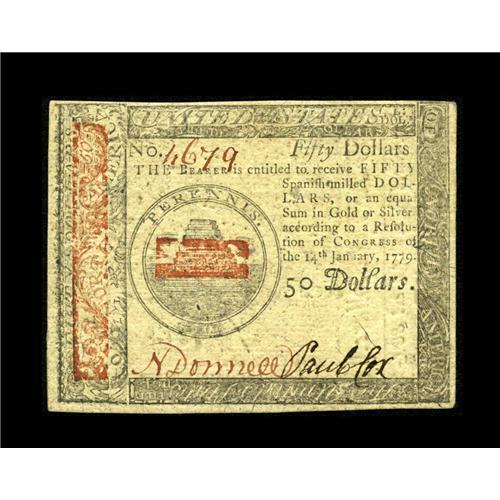 <B>Continental Currency January 14, 1779 $50 Very Choice New.</B></I> A well margined example of this rather scarce denomination which was produced for only the final two issues of Continentals. There is a bit of surface soil, but the note is crisp and delightfully original, with strong signatures.<BR><BR><b>Shipping:</b> Coin/Currency (<a target="_blank" href="http://www.heritageauctions.com/common/shipping.php">view shipping information</a>)