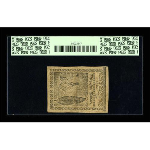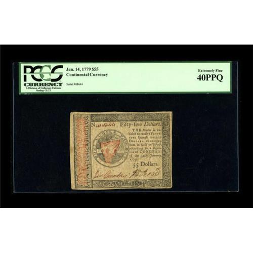 <B>Continental Currency January 14, 1779 $55 PCGS Extremely Fine 40PPQ.</B></I> A center bend and some light corner bends account for the grade on this well embossed and lightly circulated issue.<BR><BR><b>Shipping:</b> Coins & Currency (<a target="_blank" href="http://www.heritageauctions.com/common/shipping.php">view shipping information</a>)